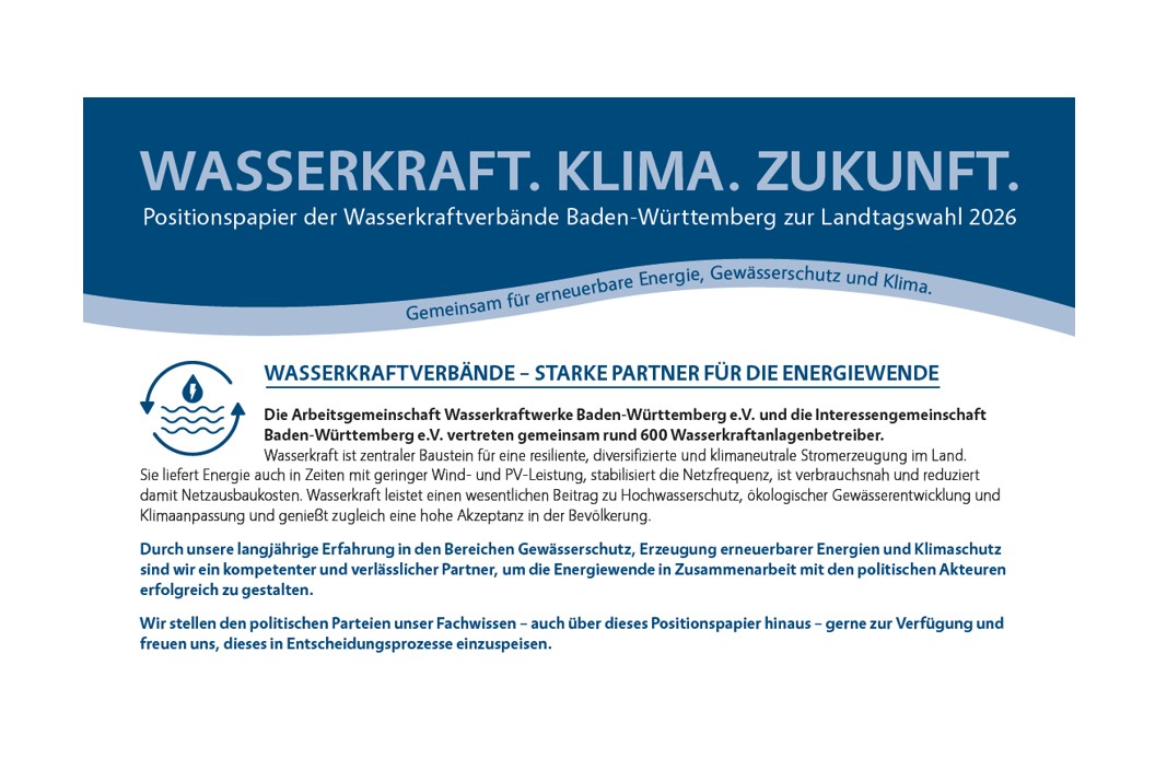 Vor diesem Hintergrund haben wir als Wasserkraftverbände in Baden-Württemberg gemeinsam ein Positionspapier erarbeitet, das wir diesem Schreiben beifügen. Darin stellen wir die Bedeutung der Wasserkraft für eine erfolgreiche Energiewende dar und formulieren konkrete Erwartungen an Politik und Verwaltung.